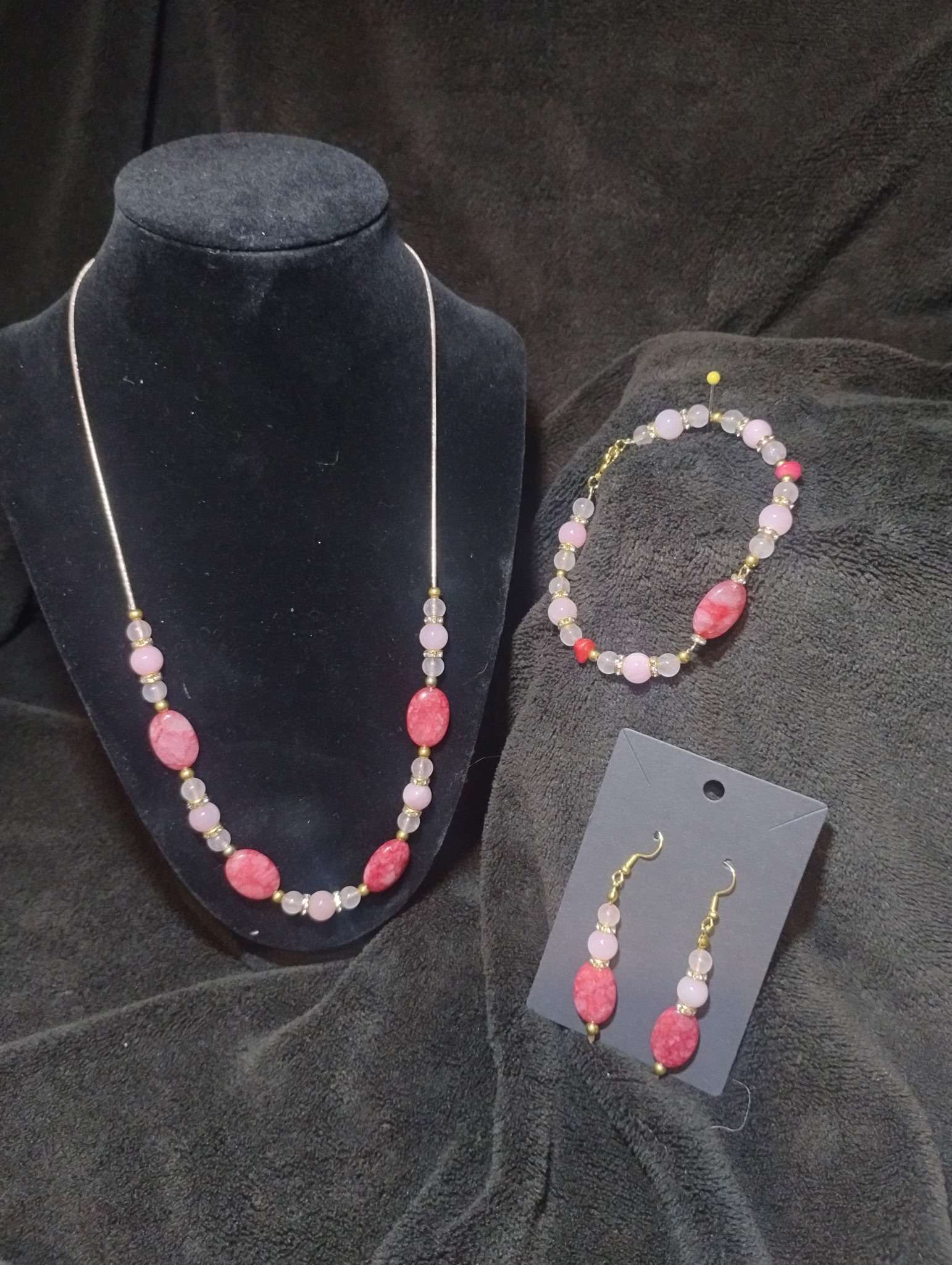 Entire set is with Rose Quartz, and Cracked Red Quartz, on a gold snake chain, Bracelet uses a clasp.