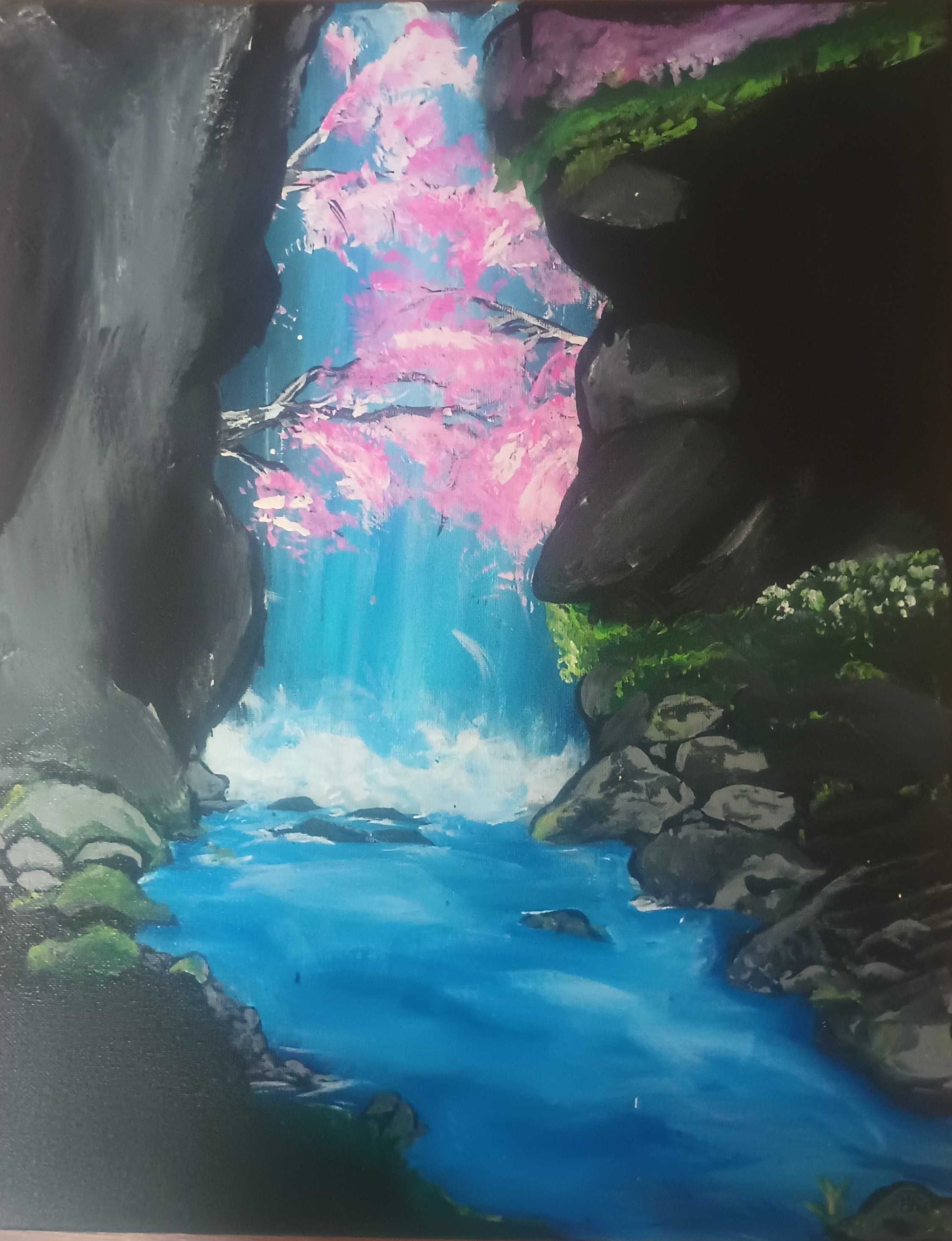 Discover a secret world of tranquility. This hand painted acrylic artwork captures a cascading waterfall framed by towering stone cliffs, with luminous blue waters flowing beneath vibrant pink blossoms.