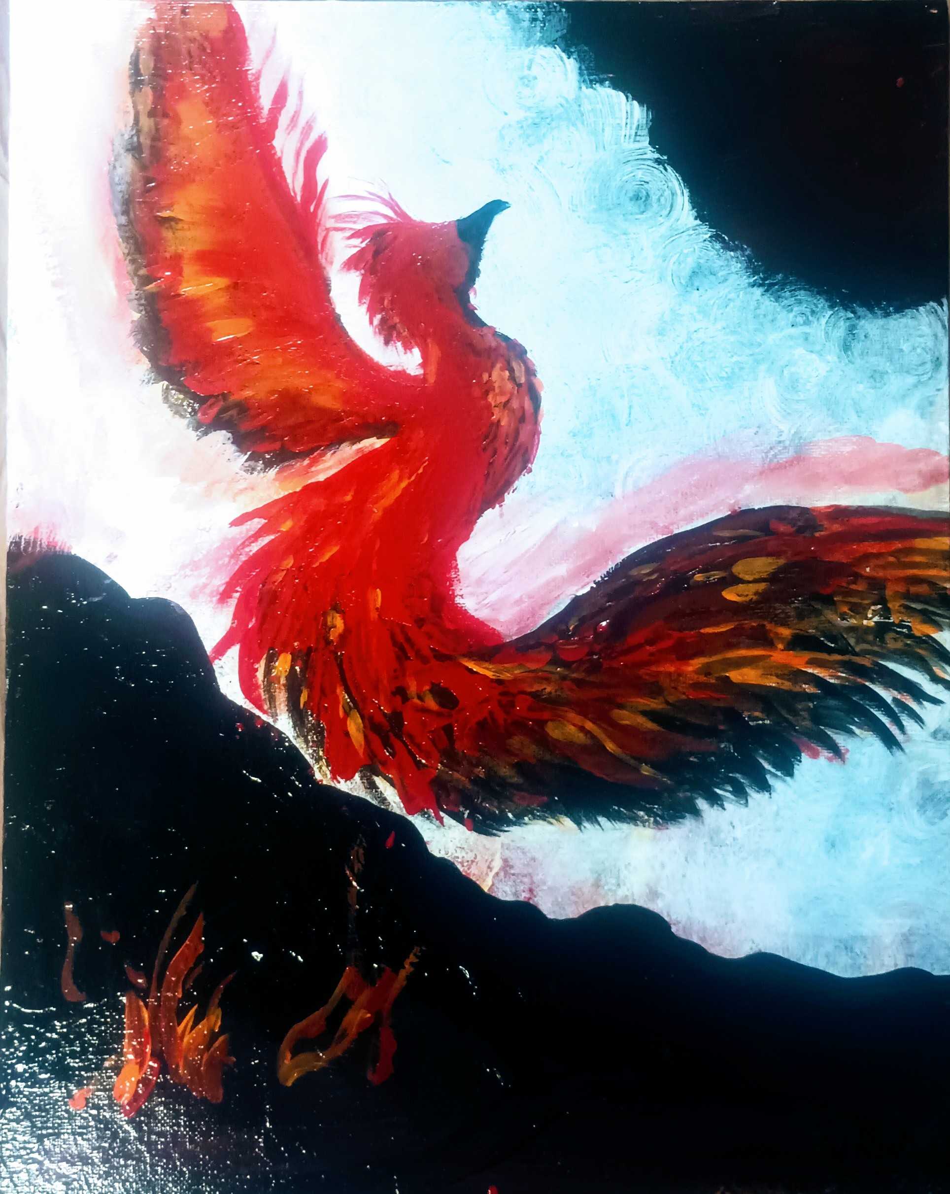From the ashes, new life takes flight. This original acrylic artwork captures the legendary phoenix in a burst of fiery reds and golds, wings, outstretched against the darkness. The swirling textures of the sky and glowing flames below create a sense of motion and rebirth, making this piece symbolic as it is striking.